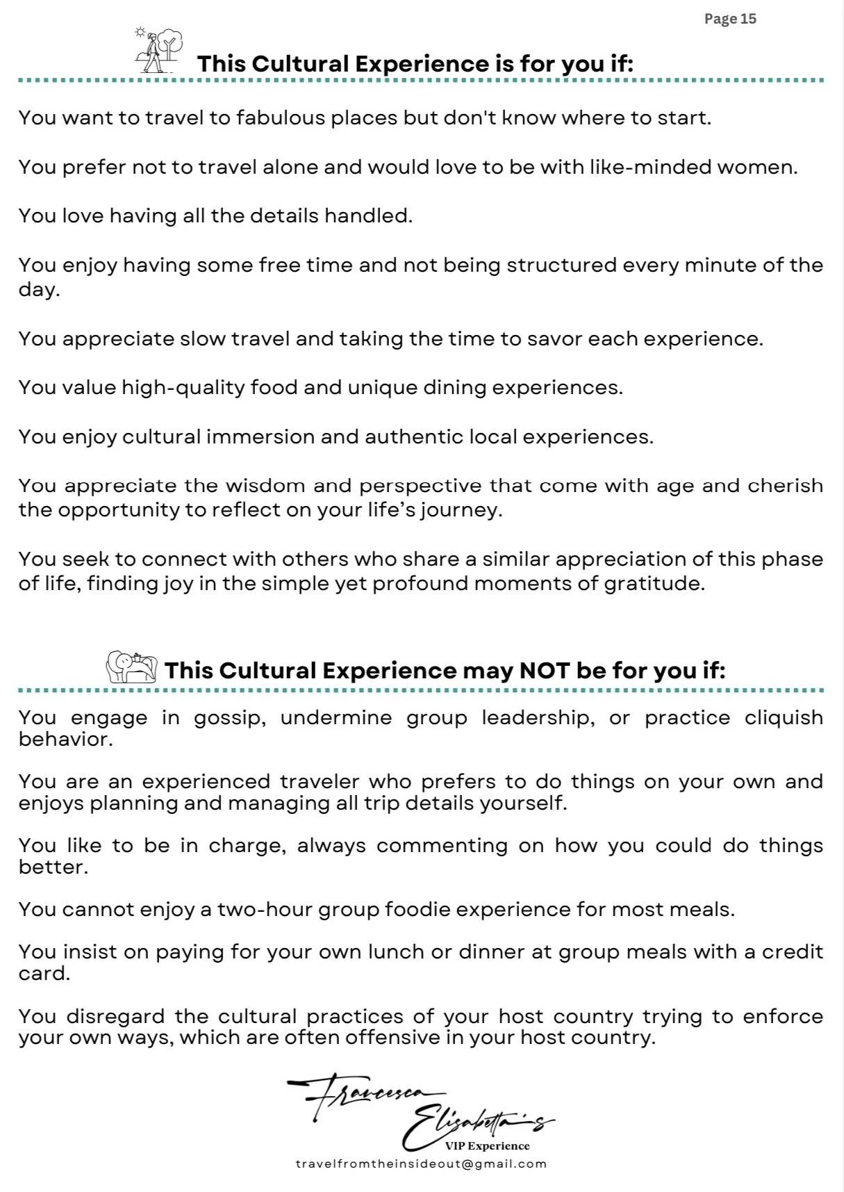 Once you have made your deposit, please book a private call with Francesca to discuss cultural experience details and choose your room size!