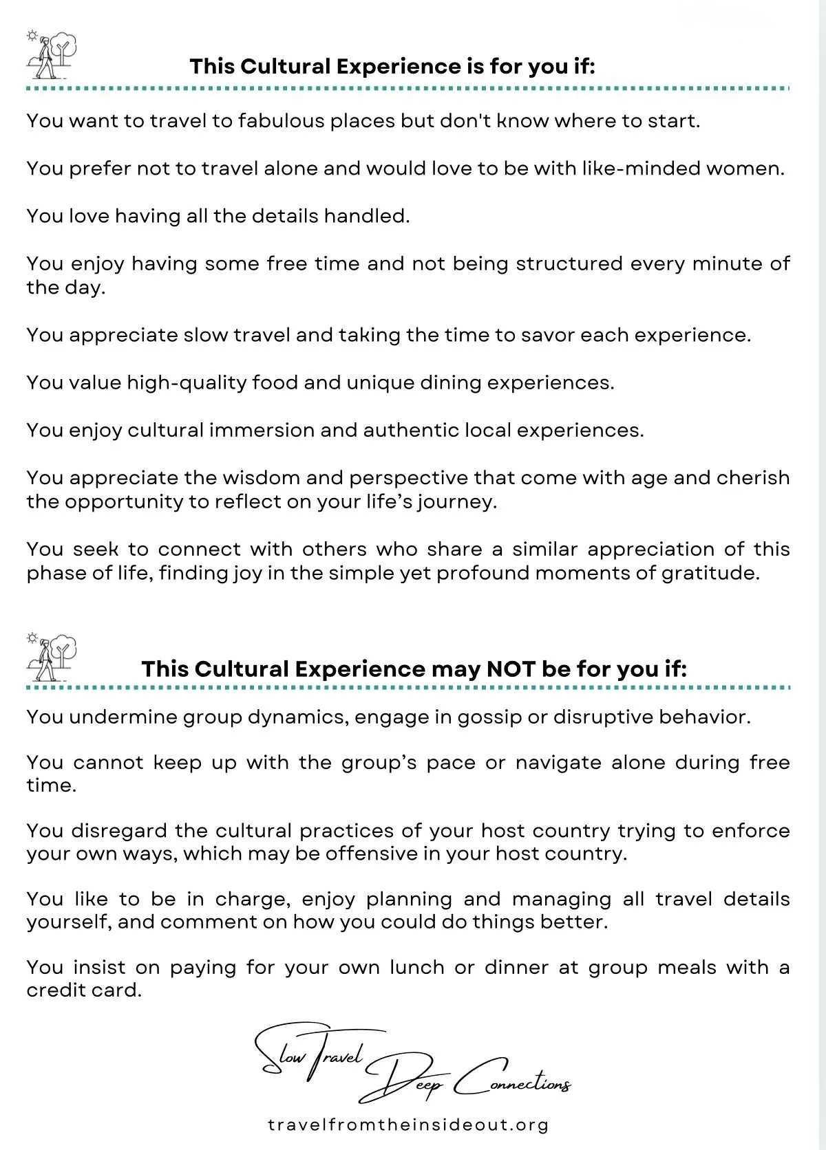 Once you have made your deposit, please book a private call with Francesca to discuss cultural experience details!