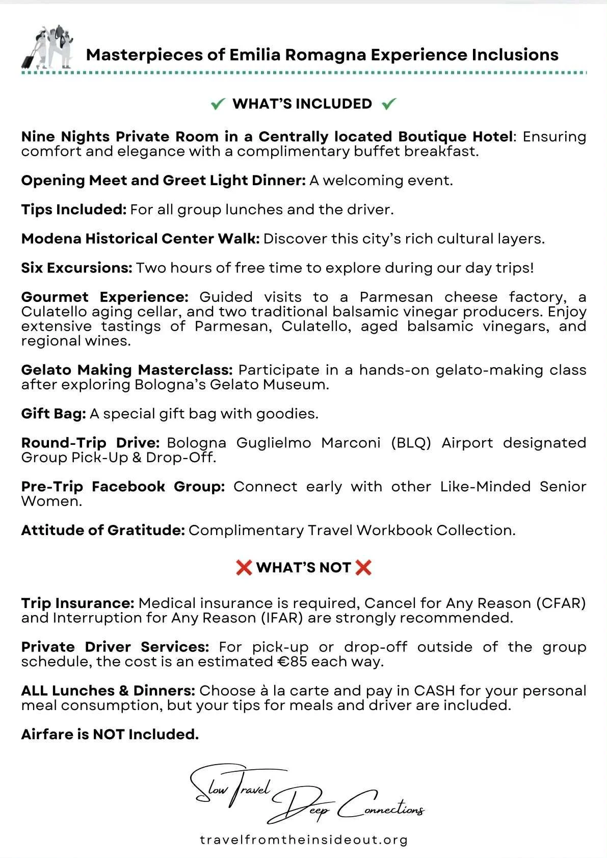 This Masterpieces of Emilia Romagna Cultural Experience is limited to 6 participants. The hotel rooms are located on the second floor and there is no elevator.